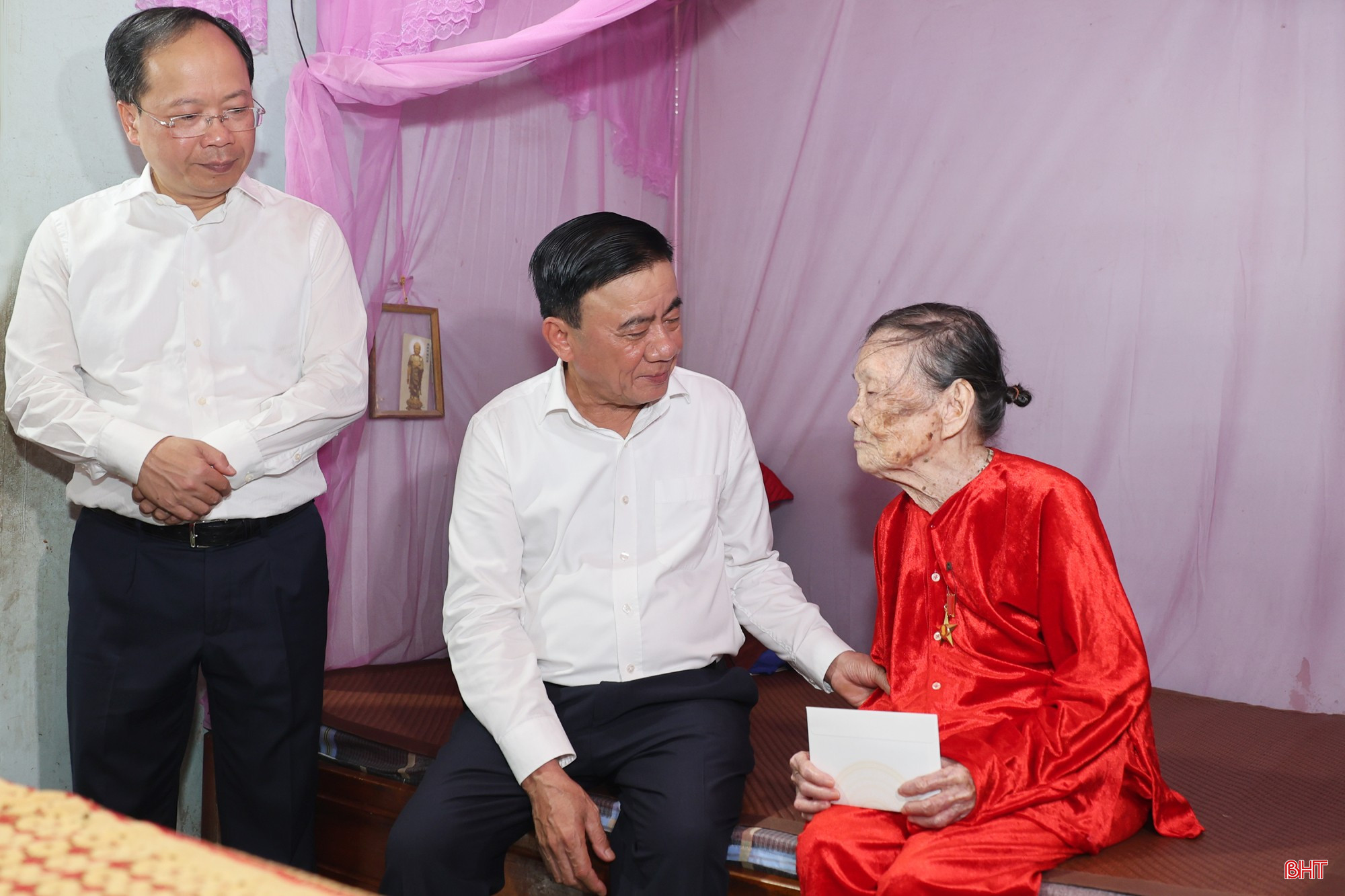 Đồng chí Trần Cẩm Tú - Ủy viên Bộ Chính trị, Thường trực Ban Bí thư ân cần thăm hỏi sức khỏe, đời sống của Mẹ Việt Nam anh hùng Nguyễn Thị Minh và mong mẹ tiếp tục sống vui, sống khỏe, là chỗ dựa tinh thần, tấm gương sáng cho con cháu, thế hệ trẻ noi theo.
