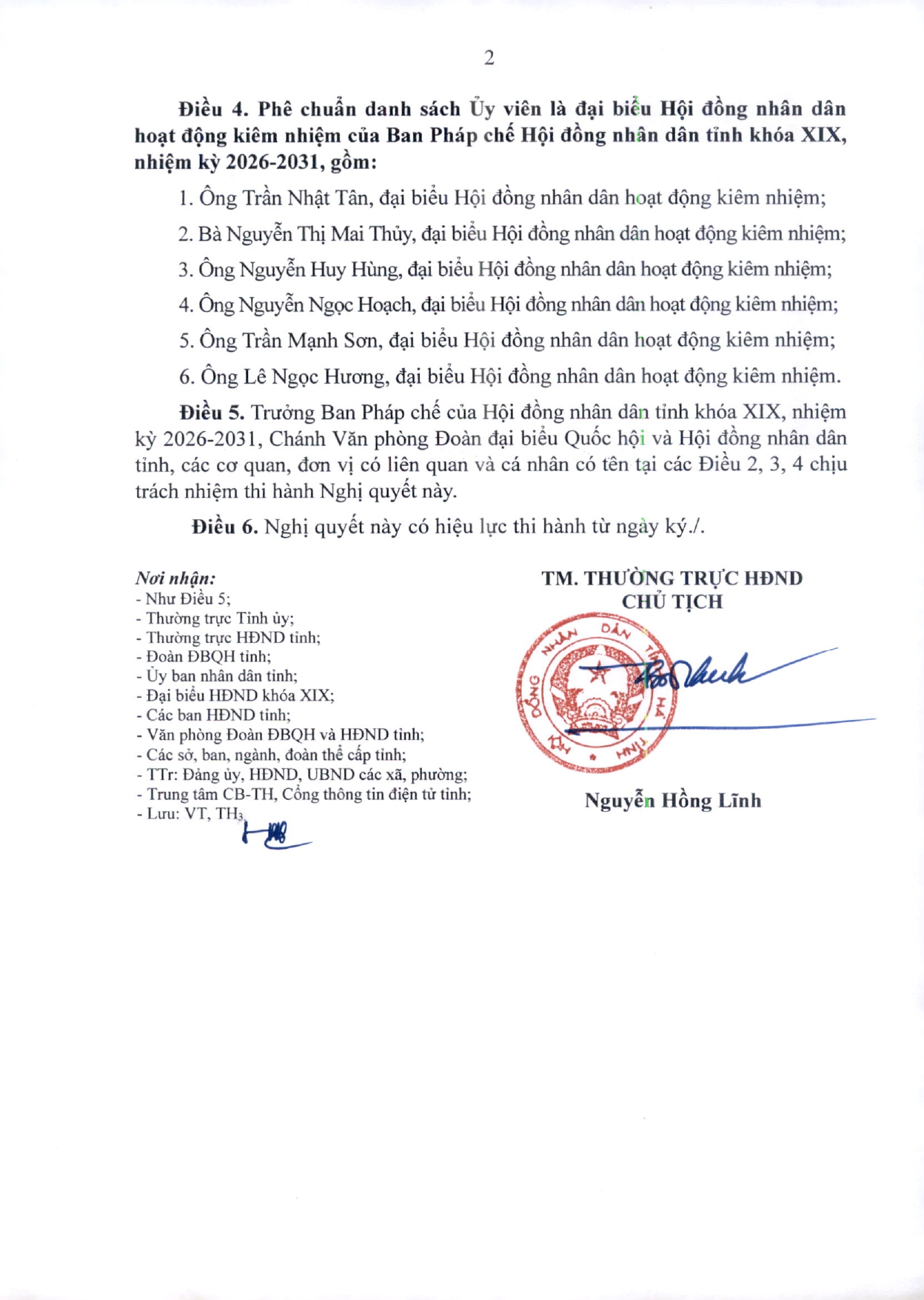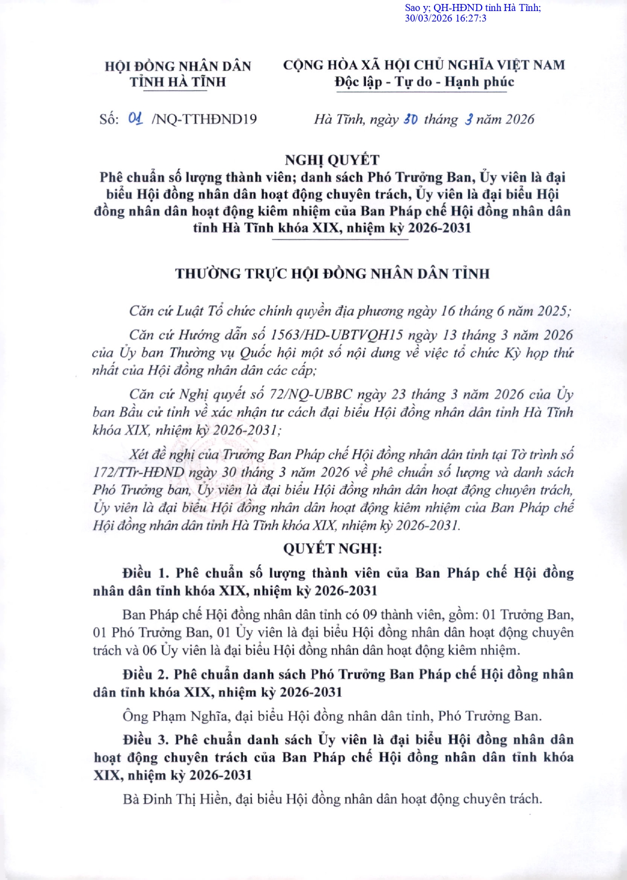 Ngày 30/3, Thường trực HĐND tỉnh công bố nghị quyết phê chuẩn số lượng thành viên; danh sách Phó Trưởng Ban, Ủy viên là đại biểu Hội đồng nhân dân hoạt động chuyên trách, Ủy viên là đại biểu Hội đồng nhân dân hoạt động kiêm nhiệm của Ban Pháp chế Hội đồng nhân dân tỉnh Hà Tĩnh khóa XIX, nhiệm kỳ 2026-2031.