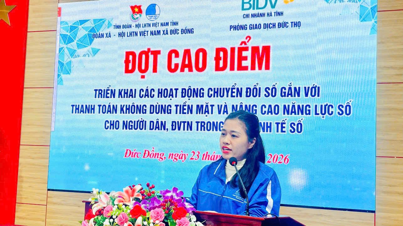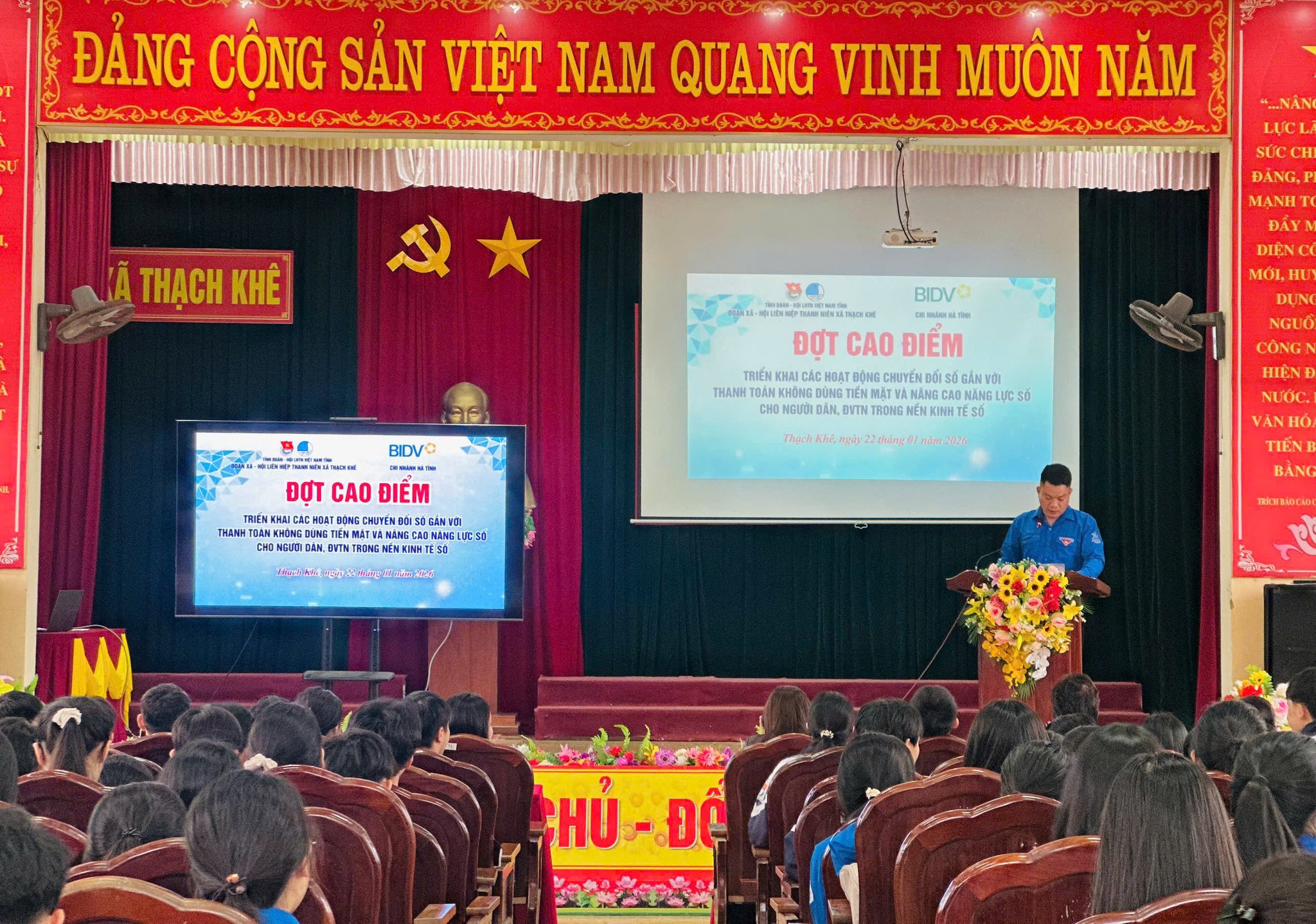Tiếp tục thực hiện chủ trương thúc đẩy chuyển đổi số quốc gia và phát triển thanh toán không dùng tiền mặt, trong tuần thứ 3 triển khai đợt cao điểm, các cấp bộ Đoàn trên địa bàn tỉnh Hà Tĩnh đã phối hợp với Ngân hàng BIDV tổ chức nhiều hoạt động thiết thực, sôi nổi tại cơ sở, góp phần nâng cao nhận thức, thay đổi thói quen thanh toán của người dân, đặc biệt là đoàn viên, thanh niên.