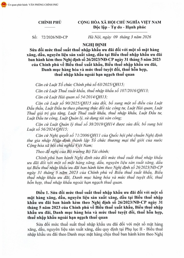 Ngày 09/03/2026, Chính phủ ban hành Nghị định số 72/2026/NĐ-CP sửa đổi mức thuế suất thuế nhập khẩu ưu đãi đối với một số mặt hàng xăng dầu, nguyên liệu sản xuất xăng, dầu tại Biểu thuế nhập khẩu ưu đãi ban hành kèm theo Nghị định số 26/2023/NĐ-CP ngày 31/5/2023 của Chính phủ về Biểu thuế xuất khẩu, Biểu thuế nhập khẩu ưu đãi, Danh mục hàng hóa và mức thuế tuyệt đối, thuế hỗn hợp, thuế nhập khẩu ngoài hạn ngạch thuế quan.