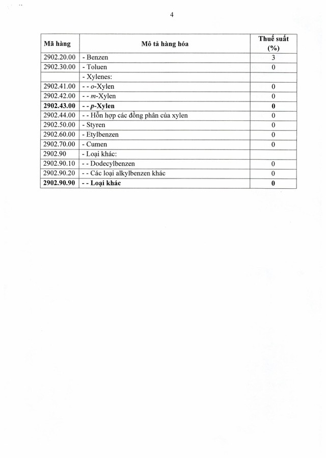 Ngoài ra, một số nguyên liệu hóa dầu như xylen, condensate, p-xylen được giảm thuế từ 3% xuống 0%, còn hydrocarbon mạch vòng loại khác giảm từ 2% xuống 0%.