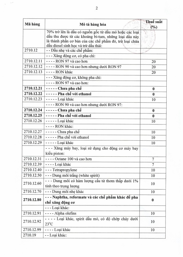 Cụ thể, giảm thuế suất thuế nhập khẩu ưu đãi từ 10% xuống 0% đối với xăng động cơ không pha chì (các mã HS 2710.12.21 - Chưa pha chế); 2710.12.22 - Pha chế với ethanol; 2710.12.24 - Chưa pha chế; 2710.12.25 - Pha chế với ethanol) và các nguyên liệu pha chế xăng như naphtha, reformate (mã HS 2710.12.80).