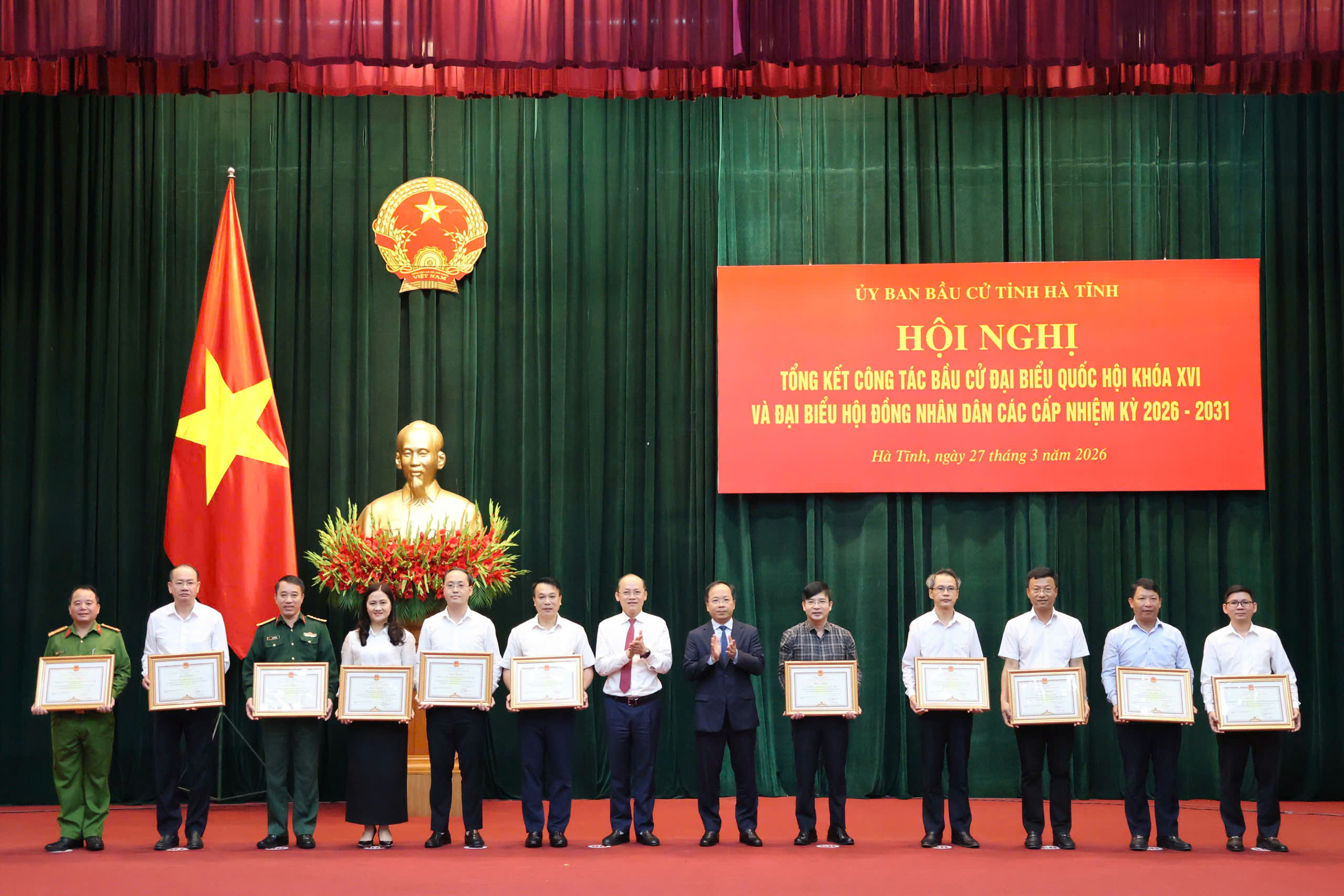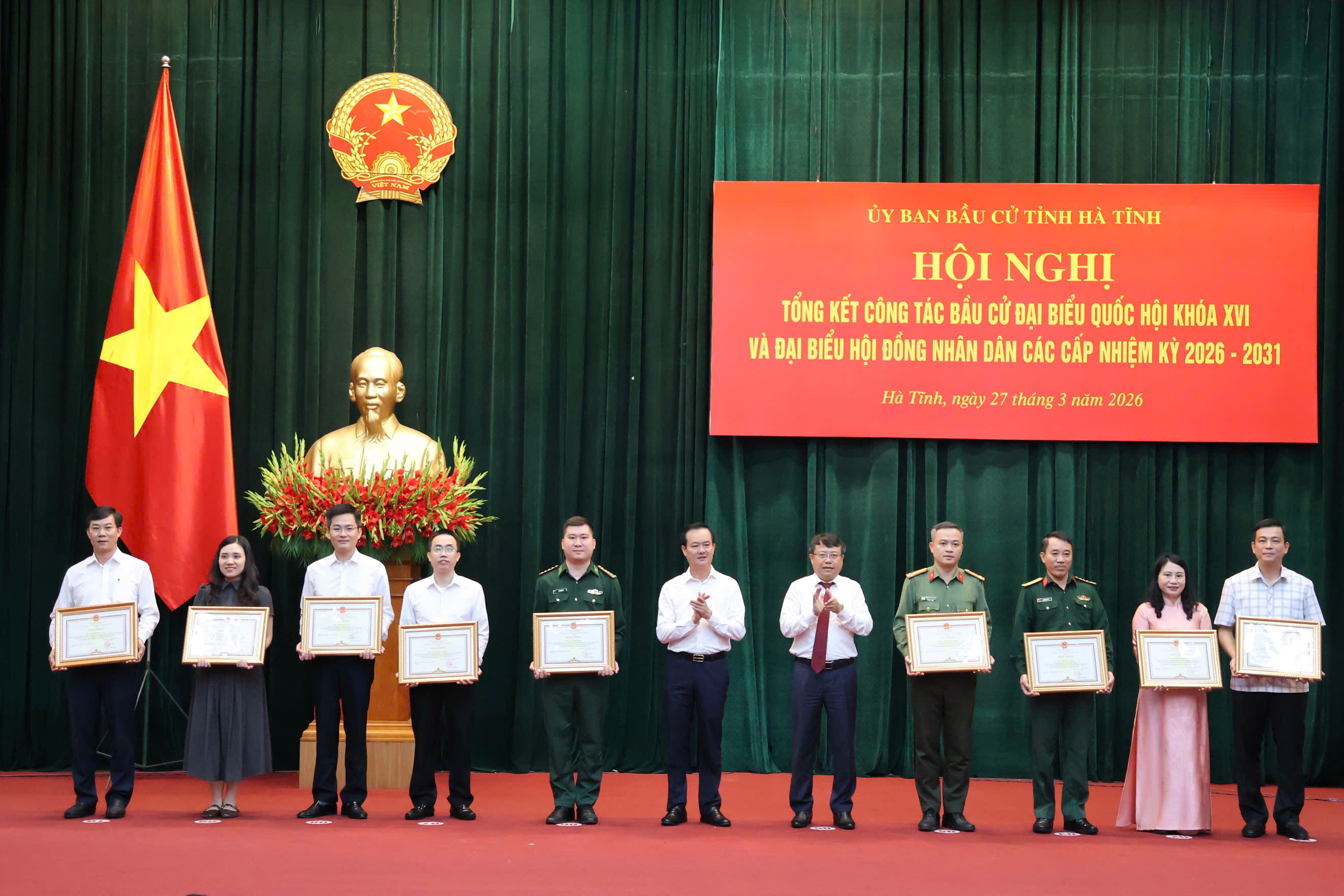 Đồng chí Nguyễn Duy Lâm - Ủy viên BCH Trung ương Đảng, Bí thư Tỉnh ủy, Trưởng ban Chỉ đạo Bầu cử tỉnh và đồng chí Nguyễn Hồng Lĩnh - Phó Bí thư Thường trực Tỉnh ủy, Chủ tịch HĐND tỉnh, Phó Trưởng ban Thường trực Ban Chỉ đạo Bầu cử tỉnh, Chủ tịch Ủy ban Bầu cử tỉnh tặng bằng khen cho các tập thể.