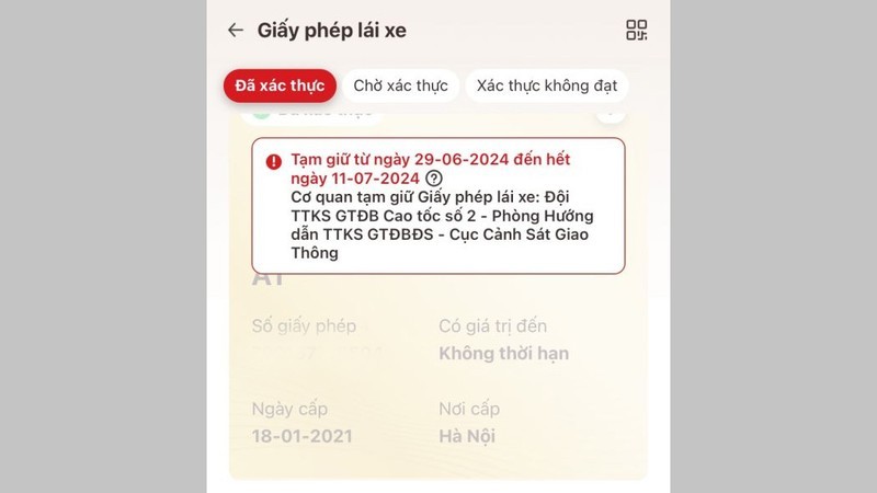 Hình ảnh hiển thị tạm giữ Giấy phép lái xe trên VNEID của công dân. (Ảnh: Cục Cảnh sát giao thông)