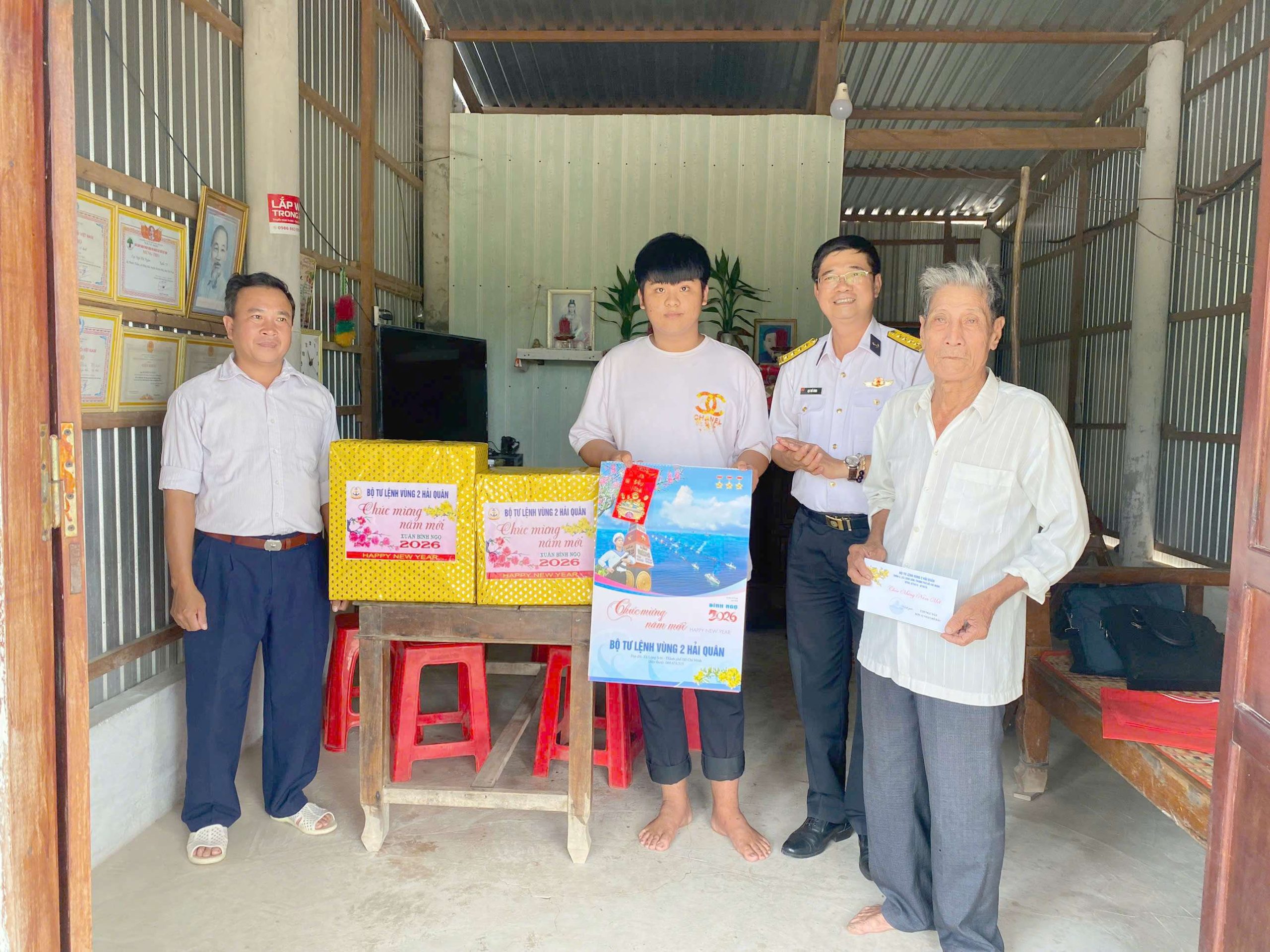 Tham dự và trực tiếp trao quà có Đại tá Lại Thế Công, đại diện Phòng Chính trị Vùng 2 Hải quân. Phối hợp cùng cấp ủy, chính quyền địa phương, đoàn công tác đã đến thăm từng gia đình, gửi lời chúc mừng năm mới Bính Ngọ 2026 và động viên các cháu bước sang năm mới với nhiều niềm vui, quyết tâm học tập tốt.