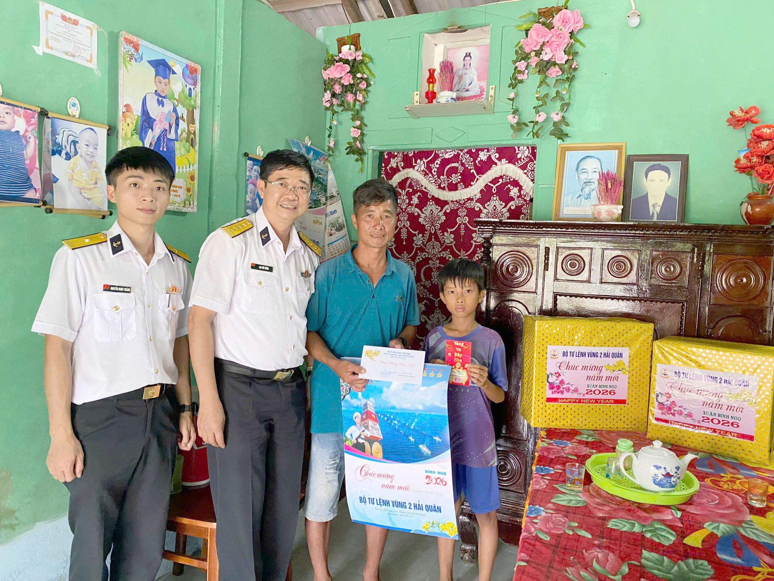 Mỗi cháu được trao 2 phần quà Tết, 3 triệu đồng tiền mặt cùng 1 cuốn lịch của Bộ Tư lệnh Vùng 2 Hải quân. Dịp này, đơn vị còn cử cán bộ quân y đến thăm khám, chăm sóc sức khỏe cho các cháu và người thân trong gia đình, thể hiện sự quan tâm toàn diện cả về vật chất lẫn tinh thần.