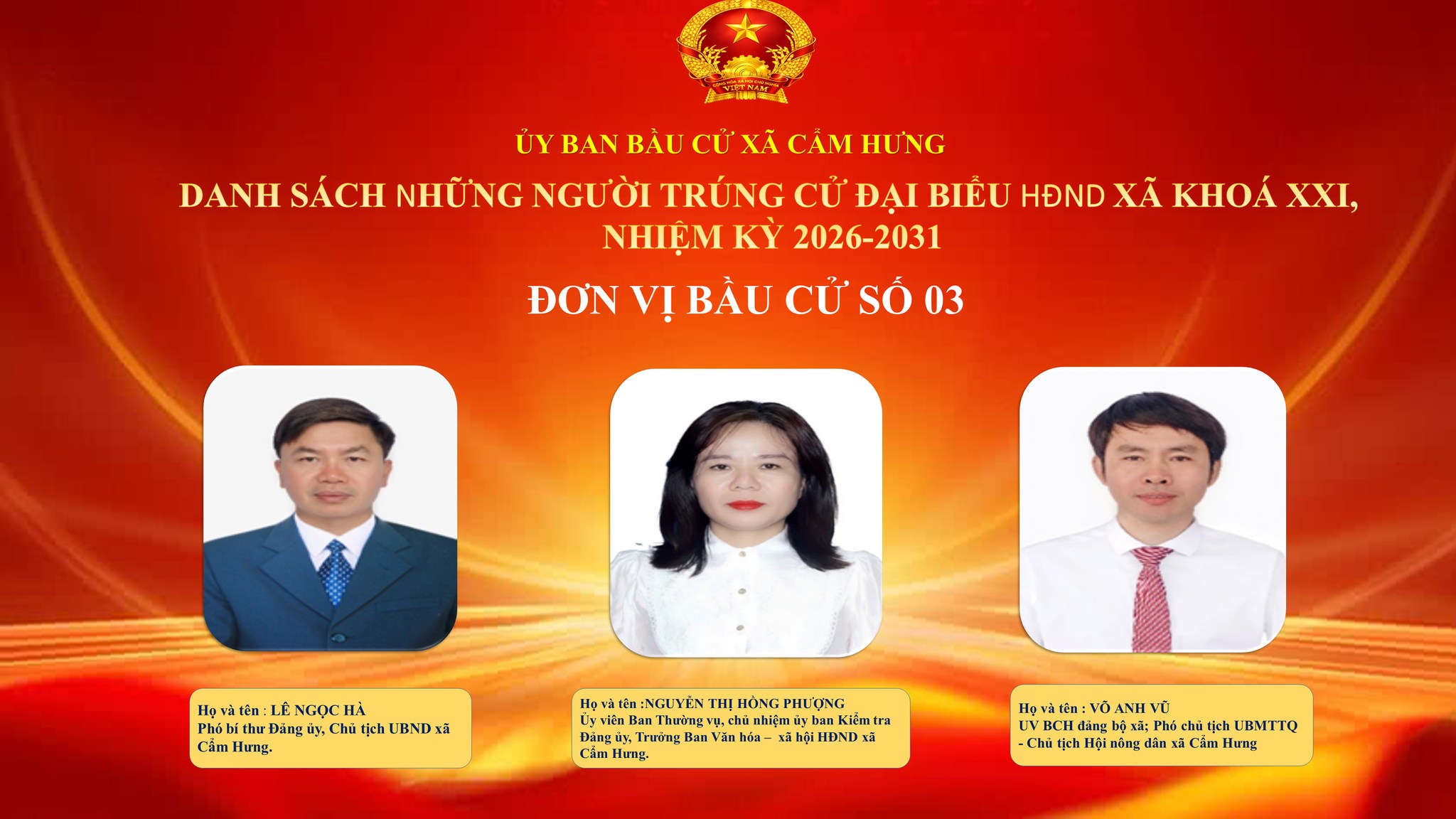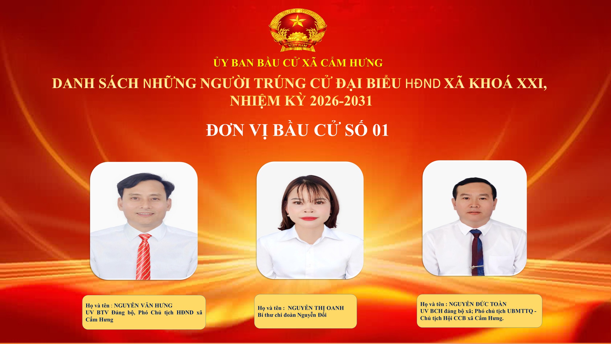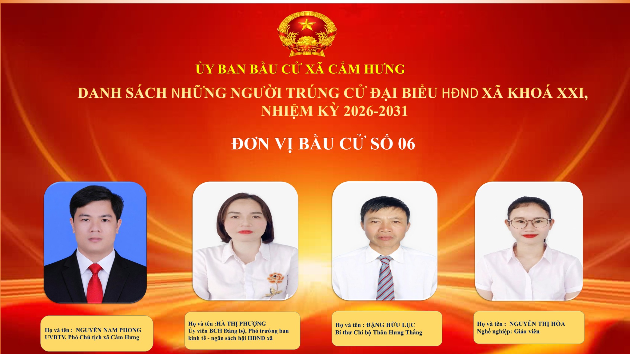 Ủy ban bầu cử xã Cẩm Hưng chính thức công bố kết quả bầu cử đại biểu Hội đồng nhân dân xã khóa XXI, nhiệm kỳ 2026 – 2031 theo đúng quy định của pháp luật, bảo đảm dân chủ, công khai, minh bạch và đúng trình tự, thủ tục.