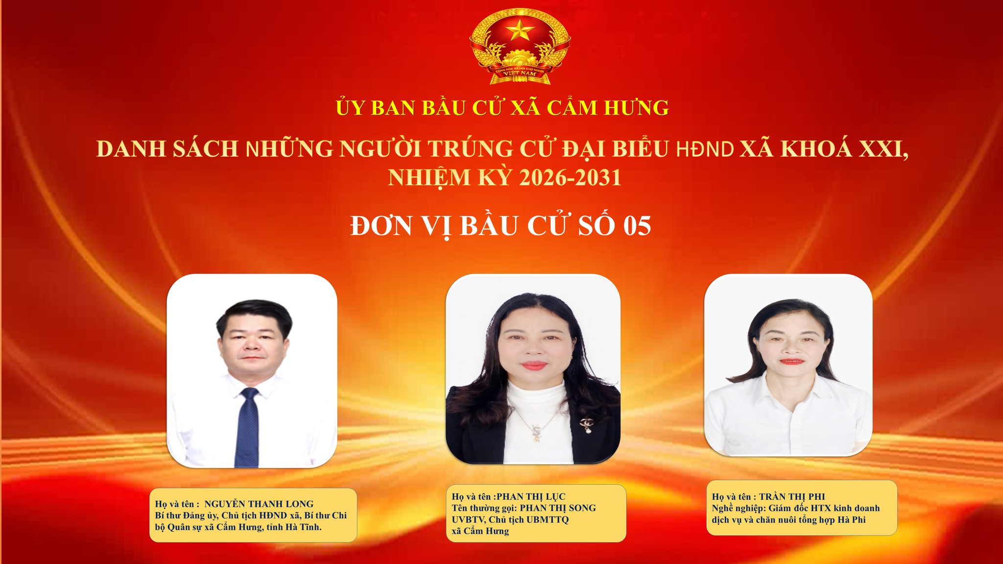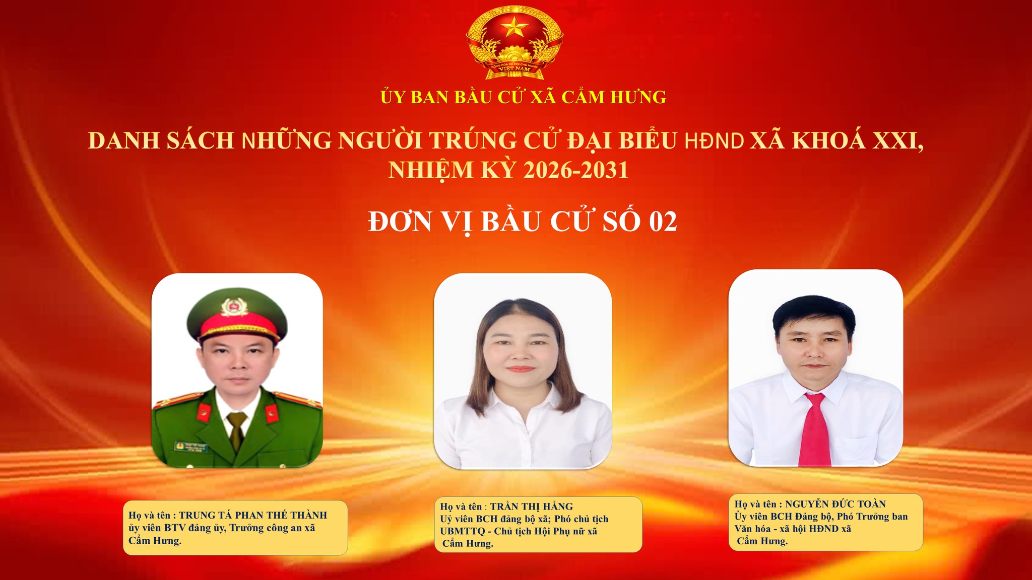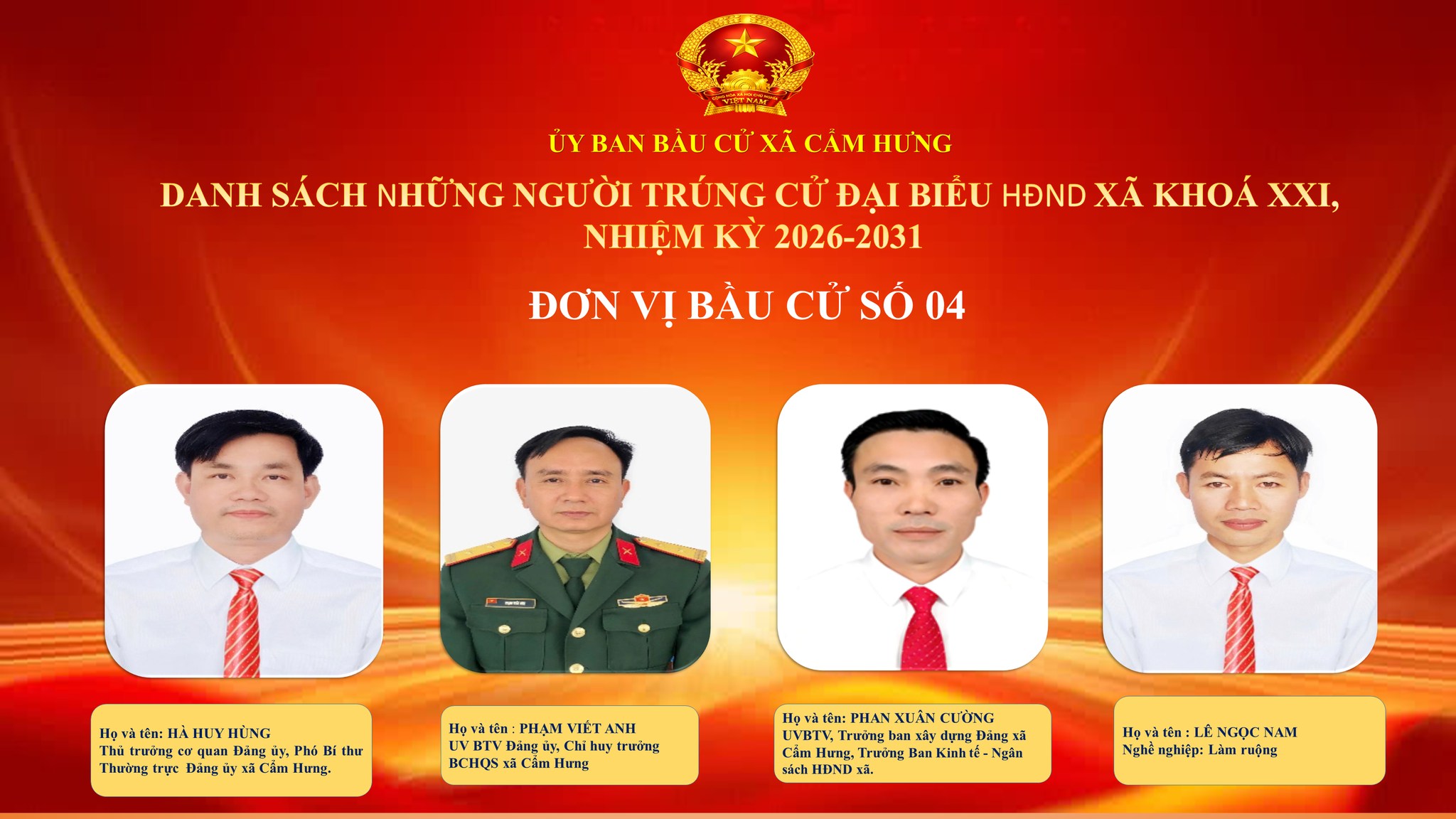 Ủy ban bầu cử xã Cẩm Hưng chính thức công bố kết quả bầu cử đại biểu Hội đồng nhân dân xã khóa XXI, nhiệm kỳ 2026 – 2031 theo đúng quy định của pháp luật, bảo đảm dân chủ, công khai, minh bạch và đúng trình tự, thủ tục.