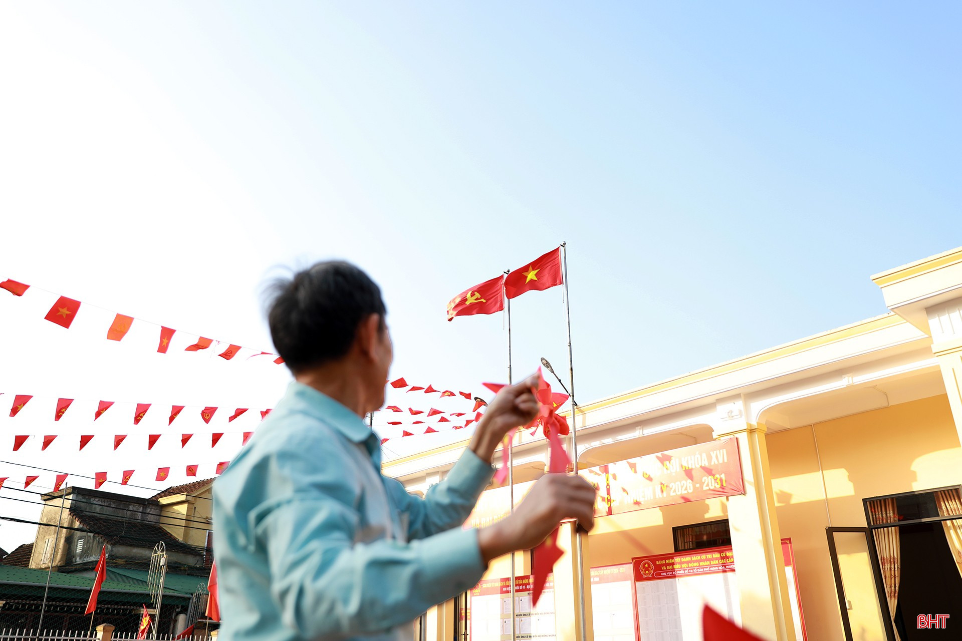... đến các điểm bỏ phiếu tại các tổ dân phố được chỉnh trang sạch đẹp. Cờ Đảng, cờ Tổ quốc, băng rôn, khẩu hiệu được treo trang trọng, tạo không khí rực rỡ, phấn khởi hướng về ngày bầu cử.Anh Nguyễn Quốc Khánh (TDP Liên Sơn, phường Hoành Sơn) cho biết: "Bà con trong tổ dân phố rất phấn khởi khi thấy các tuyến đường, khu dân cư được trang trí cờ hoa rực rỡ. Chúng tôi ý thức rằng, đây là quyền và trách nhiệm của mình nên sẽ sắp xếp thời gian để tham gia bỏ phiếu đầy đủ, góp phần lựa chọn những đại biểu xứng đáng...".